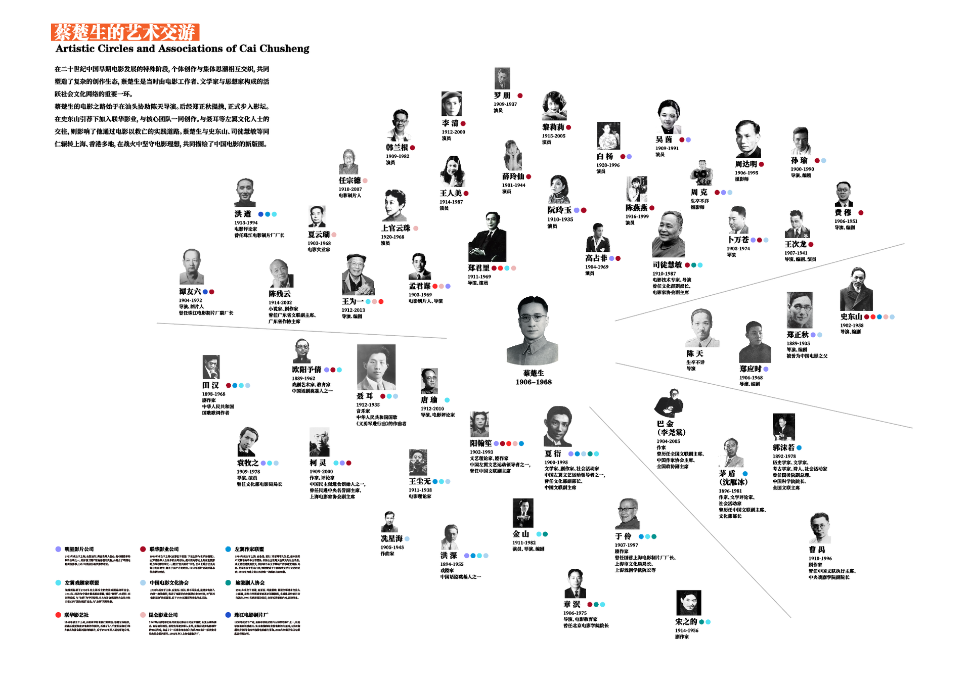 左下方的机构图例中,不同颜色代表着不同的电影公司或文艺组织,每个人物旁都标注了其所属机构的色标。